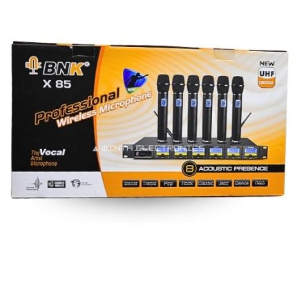 - Six Microphone Channels – BNK X85 Supports up to 6 separate microphones simultaneously, allowing multiple users to perform or speak without interference, using a UHF 600-850MHz frequency range.